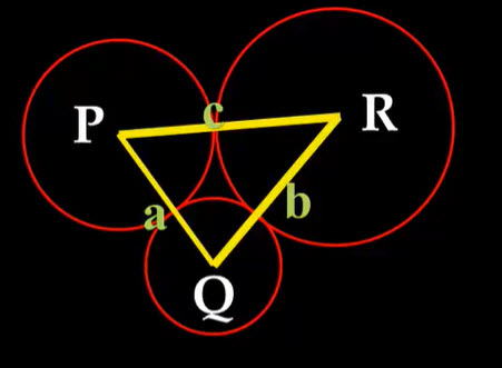 যেহুতু, P, Q, R কেন্দ্রবিশিষ্ট বৃত্ত পরস্পরকে স্পর্শ করে। তাই PQ হবে P ও Q কেন্দ্রবিশিষ্ট বৃত্তের ব্যাসার্ধের সমষ্টির সমান।