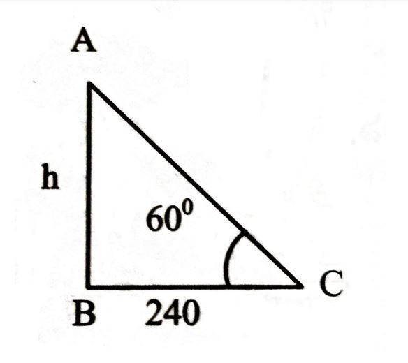 সূর্যের উন্নিত কোণ 60° হলে একটি মিনারের ছায়ার দৈর্ঘ্য 240 মিটার হয়। মিনারটির উচ্চতা কত?