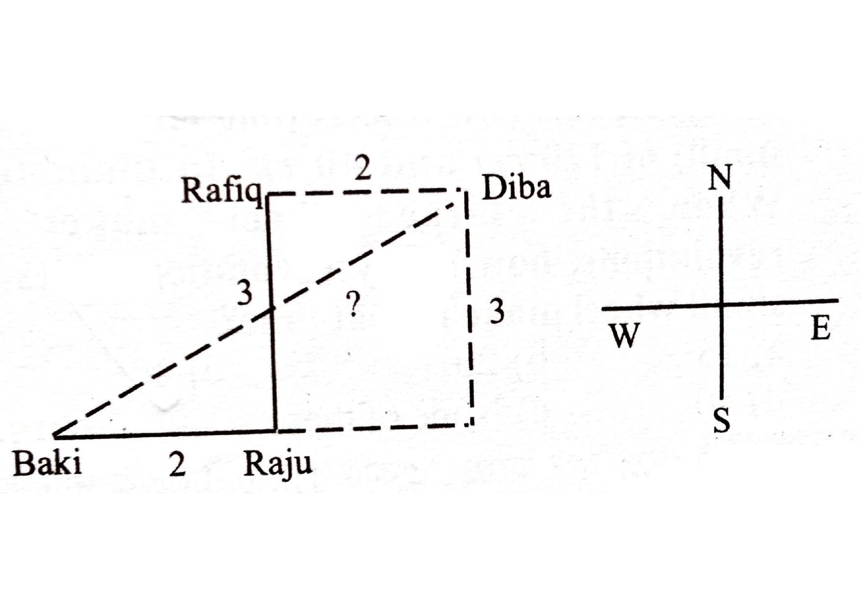 প্রশ্নে বলা হচ্ছে, Baki, Raju'র বাড়ির 2 মাইল পশ্চিমে থাকে, Rafiq, Raju'র বাড়ির 3 মাইল দক্ষিণে এবং Diba'র বাড়ির 2 মাইল পশ্চিমে থাকে। Baki’র বাড়ি থেকে Diba'র বাড়ির সরাসরি দূরত্ব কত?