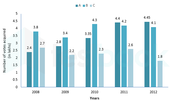 Passage : Direction: Study the following graph to answer the questions given below it. The bar graph shows the performance of 3 political parties A, B and C in terms of votes acquired in the election in a constituency during 2008 to 2012. |