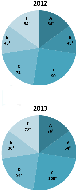 Directions: Study the following pie-charts carefully and answer accordingly. The pie-charts show the distribution of expenses over the six different items A, B, C, D, E and F of a person for 2012 and 2013. He spent Rs. 36000 in 2012 and Rs. 40000 in 2013.