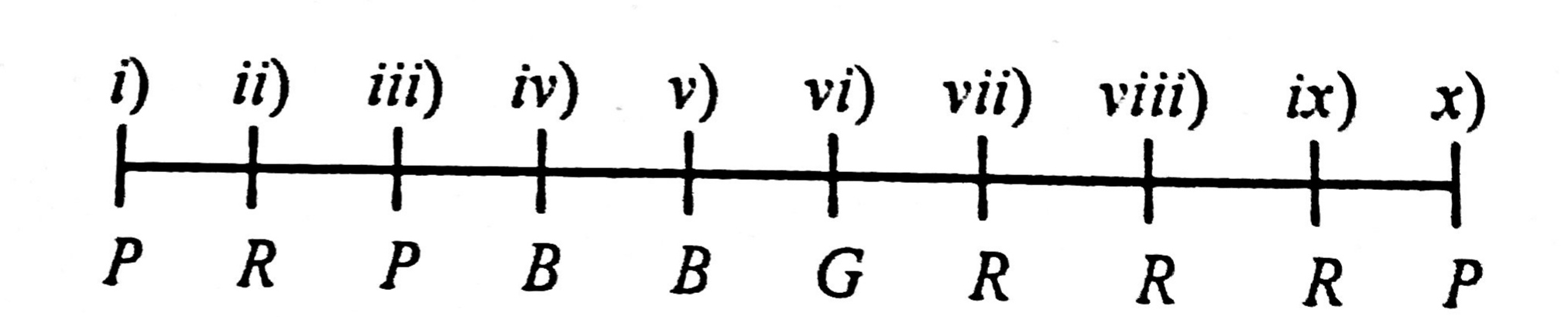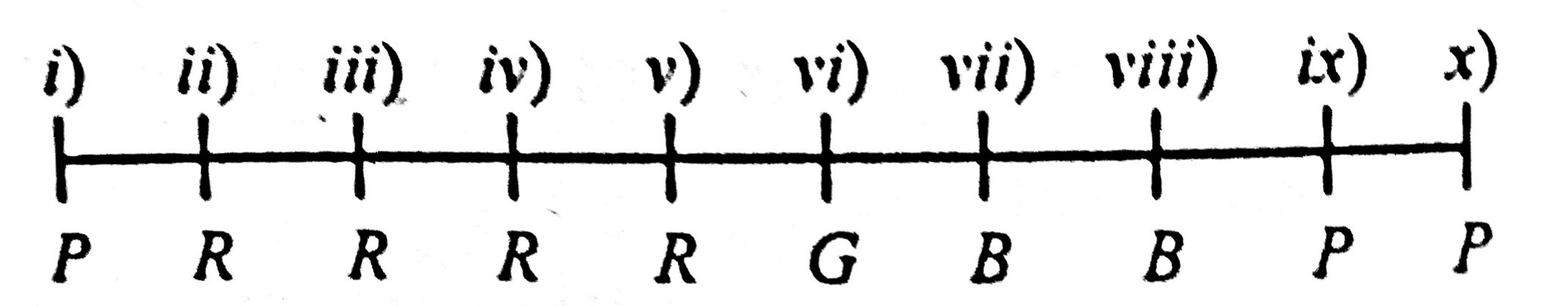 Ten fabrics of different colors are displayed on ten racks in a cloth store. The racks are placed one after another and numbered consecutively from one to ten. Each rack contains fabric of a single color. One fabric is green, two fabrics are brown, three fabrics are purple and remaining four fabrics are red.
