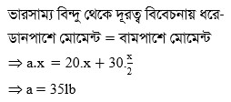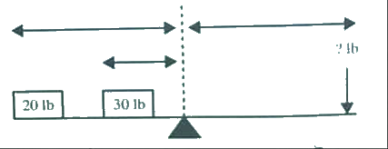 - ছবিতে বাম পাশে দুটি ২০ পাউন্ডের ওজন আছে। এদের মোট মোমেন্ট ডান পাশের মোমেন্টের সমান হতে হবে। - যদিও দূরত্বের কোনো নির্দিষ্ট মান দেওয়া নেই, তবে আনুপাতিক হিসাব থেকে দেখা যায় যে, যদি আমরা ধরি ফালক্রাম থেকে কাছের বস্তুটির দূরত্ব ৩ একক এবং দূরের বস্তুটির দূরত্ব ৪ একক হয়, তাহলে হিসাবটি মিলে যায়। - এক্ষেত্রে, বাম পাশের মোট মোমেন্ট = (২০ পাউন্ড × ৪ একক) + (২০ পাউন্ড × ৩ একক) = ৮০ + ৬০ = ১৪০ একক-পাউন্ড। - ডান পাশে ভারসাম্য রক্ষার জন্য মোমেন্ট ১৪০ একক-পাউন্ড হতে হবে। - চিত্র অনুযায়ী, ডান পাশের বস্তুটির দূরত্ব বাম পাশের দূরের বস্তুটির সমান, অর্থাৎ ৪ একক। - সুতরাং, ডান পাশের ওজন হবে = মোট মোমেন্ট / দূরত্ব = ১৪০ / ৪ = ৩৫ পাউন্ড।