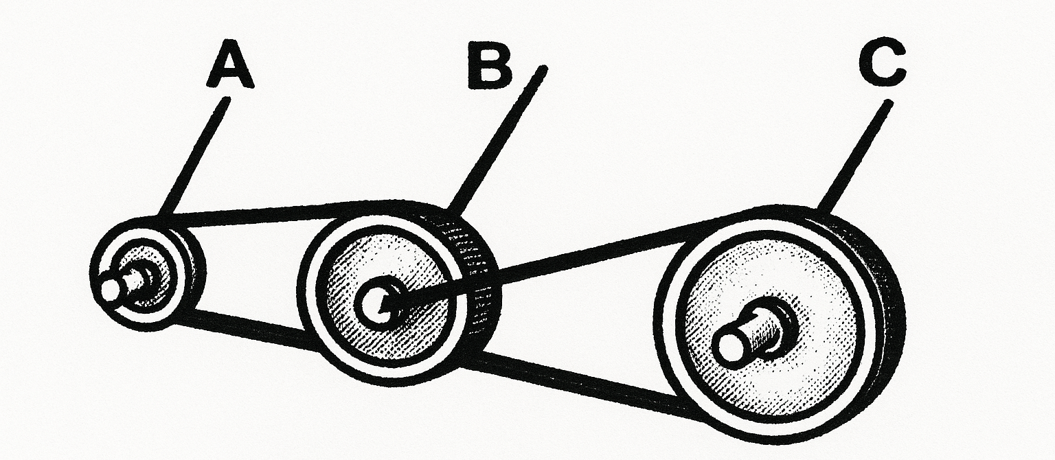- গিয়ার সিস্টেমে, ছোট গিয়ারগুলোর ঘূর্ণন হার বড় গিয়ারের তুলনায় বেশি হয়। - যেহেতু প্রশ্নে কোন ছবি নেই, ধরে নেয়া যেতে পারে যে A, B, এবং C তিনটি গিয়ার বা শ্যাফট এবং তাদের আকার বা সংযুক্তির বিষয়ে বলা হয়নি। - কিন্তু সঠিক উত্তর A বলা হয়েছে, যা নির্দেশ করে A হলো সবচেয়ে ছোট গিয়ার বা শ্যাফট, তাই এটি সবচেয়ে দ্রুত ঘুরবে।