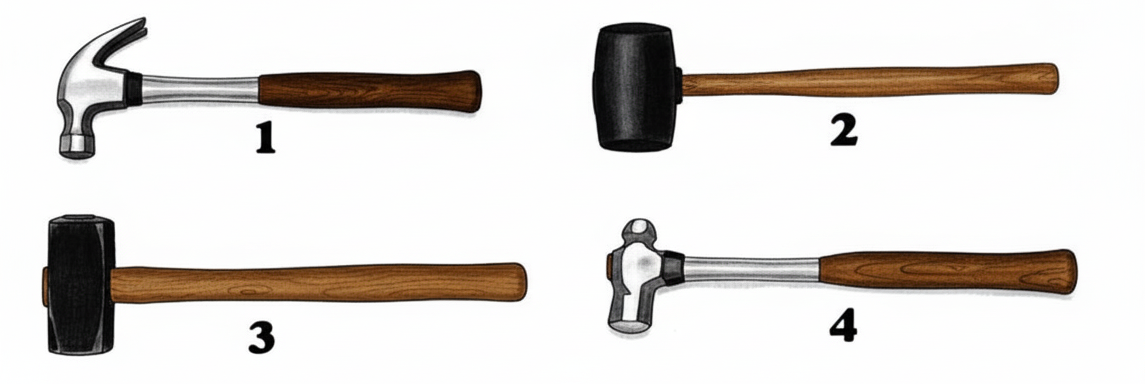- ছবিতে চার ধরনের হাতুড়ি দেখানো হয়েছে, যাদের প্রত্যেকটির ব্যবহার ভিন্ন। - ১ নং হাতুড়িটি হলো একটি ক্ল হ্যামার (Claw Hammer), যা মূলত কাঠে পেরেক ঢোকানো এবং খোলার কাজে ব্যবহৃত হয়। - ২ নং হাতুড়িটি একটি রাবার ম্যালেট (Rubber Mallet), যা নরম বস্তু বা কাঠের পৃষ্ঠে আঘাত করার জন্য ব্যবহৃত হয় যাতে পৃষ্ঠের কোনো ক্ষতি না হয়। - ৩ নং হাতুড়িটি একটি স্লেজহ্যামার (Sledgehammer), যা ভারী এবং শক্ত জিনিস ভাঙার কাজে ব্যবহৃত হয়। - ৪ নং হাতুড়িটি একটি বল-পিন হ্যামার (Ball-peen Hammer), যার এক প্রান্ত সমতল এবং অন্য প্রান্ত গোলাকার। - এর সমতল প্রান্তটি সাধারণ ঠোকার কাজে, যেমন পেরেক ঢোকাতে ব্যবহার করা যায়, যদিও এটি মূলত ধাতব কাজে বেশি ব্যবহৃত হয়। - প্রশ্নটির উত্তর অনুযায়ী, সাধারণ কাঠের কাজের জন্য ৪ নং হাতুড়িটিকে সবচেয়ে উপযুক্ত বলা হয়েছে।