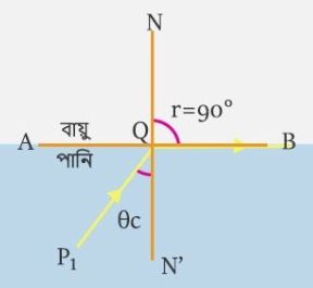 - আলো ক্রান্তি কোণের চেয়ে বেশি কোণে আপতিত হলে সেটি আর প্রতিসরিত হয় না, প্রতিফলনের সূত্রানুসারে প্রথম মাধ্যমে প্রতিফলিত হয়।