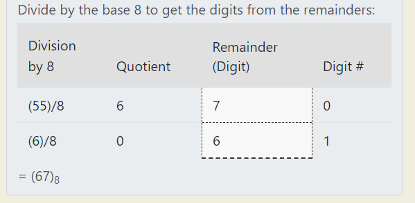 Conversion steps: 1. Divide the number by 8 2. Get the integer quotient for the next iteration. 3. Get the remainder for the octal digit. 4. Repeat the steps until the quotient is equal to 0.